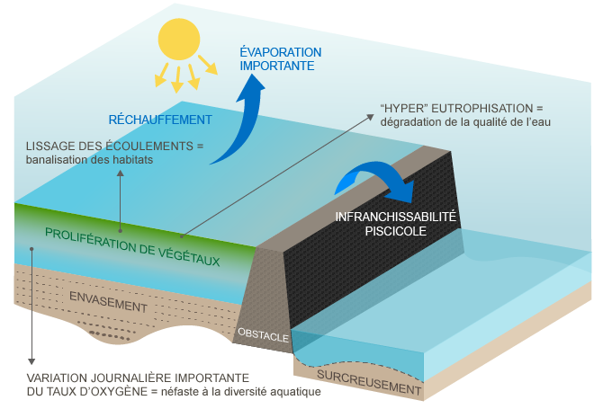 - Rupture de la continuité piscicole : empêche la libre circulation des espèces biologiques en perturbant leur accès aux zones indispensables à leur reproduction, leur croissance, leur alimentation ou leur abri. Cela concerne notamment les poissons migrateurs.